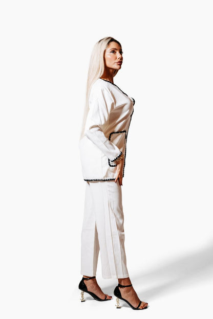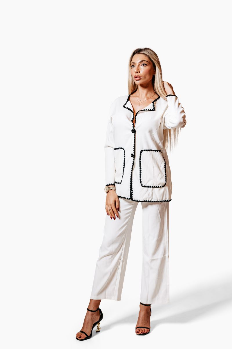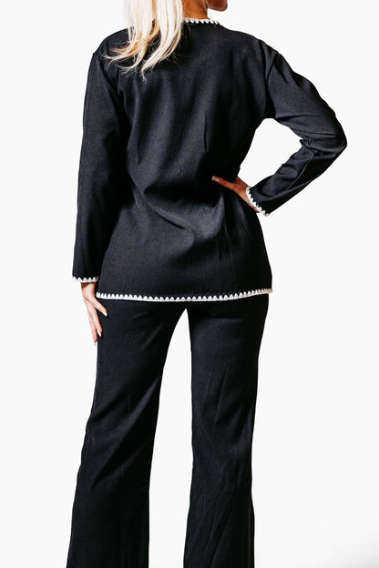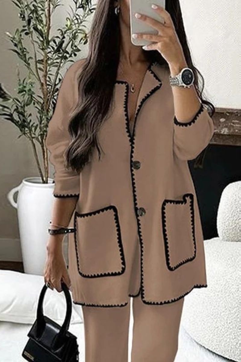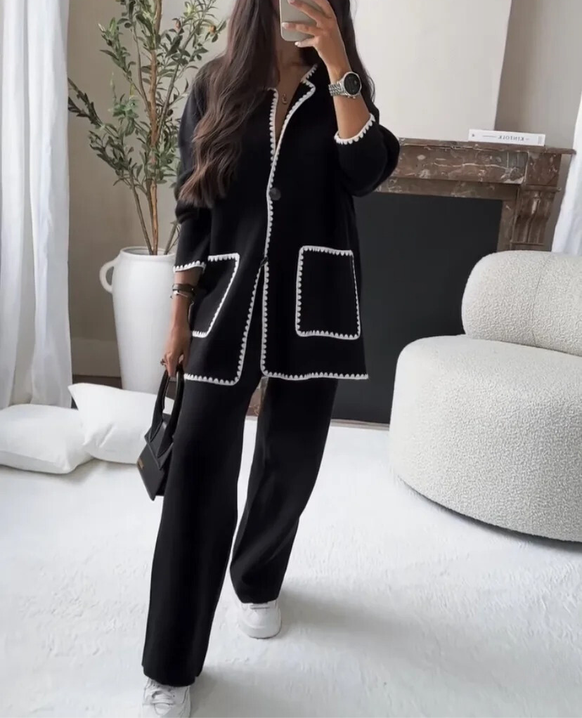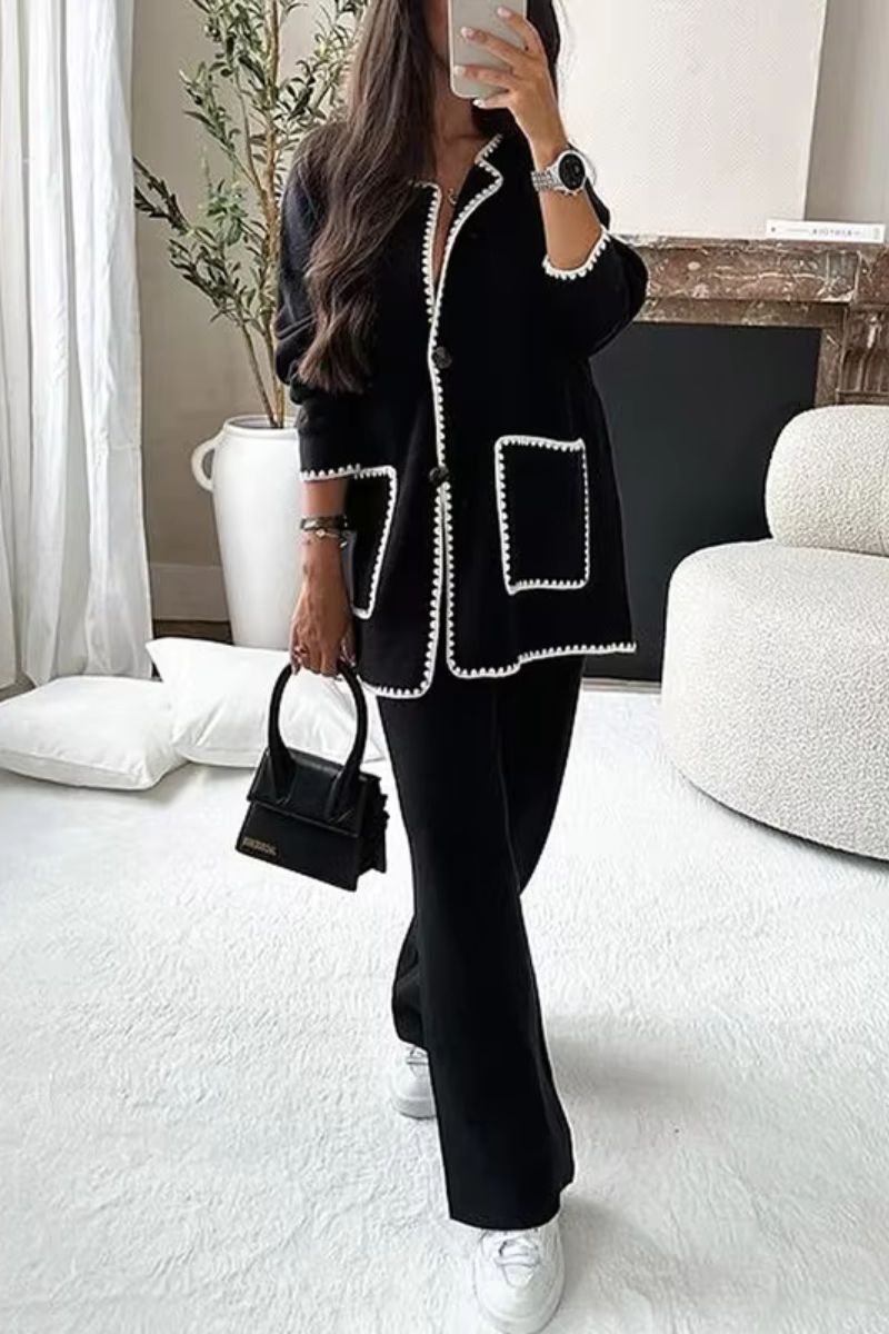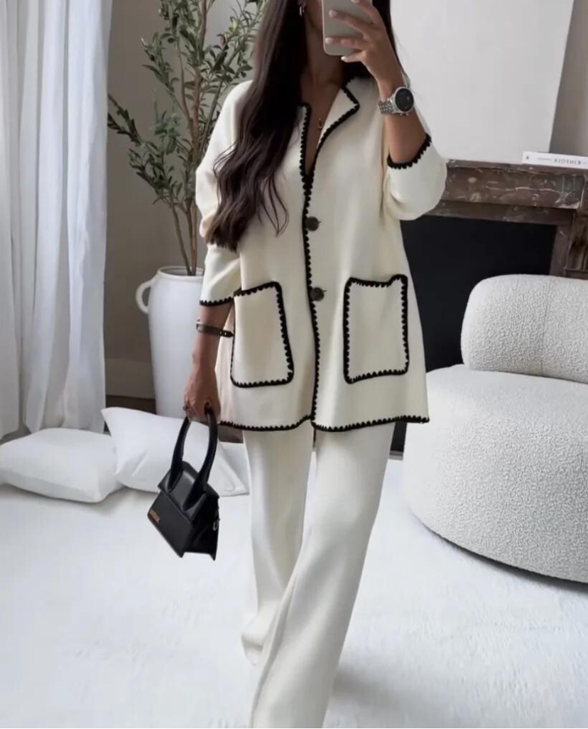 Das zweiteilige Set Elle vereint Eleganz und Komfort und ist somit ein Must-have für jede Garderobe. Dieses elegante Set besteht aus einem schicken, maßgeschneiderten Langarm-Oberteil und einer passenden, locker sitzenden Hose und sorgt dafür, dass Sie den ganzen Tag mühelos elegant aussehen.