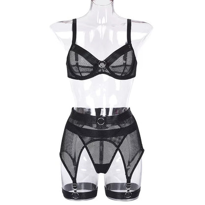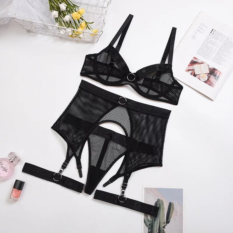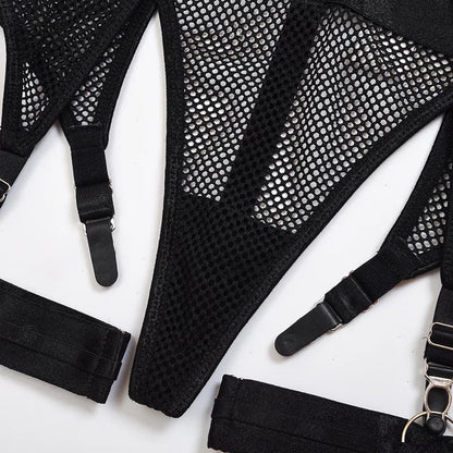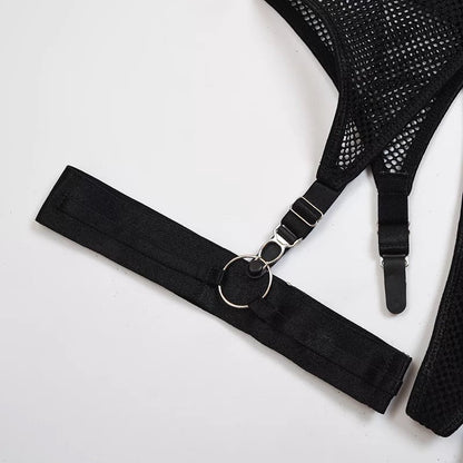 Entdecke deine wilde Seite mit unserem 4-teiligen Dessous-Set „Hooked“. Mit verstellbaren Trägern und rückenfreiem Design bietet dieses Dessous Komfort und Verführung zugleich. Steigere dein Selbstbewusstsein und entfessele deine innere Göttin in diesem exquisiten Set. Perfekt mit einem V-Ausschnitt-Jäckchen und Spitzenunterwäsche. Um Nacktheit zu vermeiden, tragen die Models hautfarbene Cups unter dem BH.