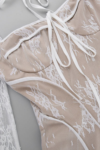 Perfekt für besondere Anlässe, Hochzeiten oder andere Events, bei denen Sie einen bleibenden Eindruck hinterlassen möchten: Das Vintage-Korsettkleid aus cremefarbener Spitze ist ein echter Hingucker. Die Midi-Länge verleiht einen Hauch von Bescheidenheit, während die zarten Spitzenärmel und der Saum eine weiche und feminine Ästhetik schaffen.