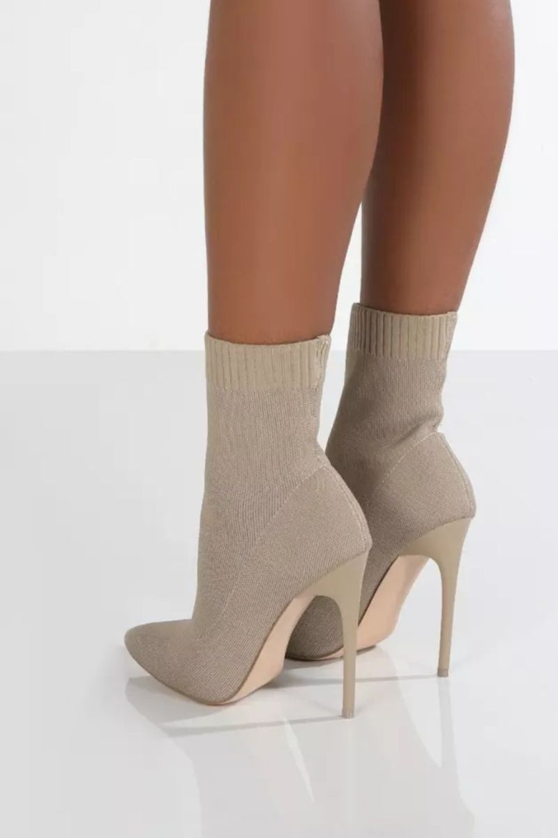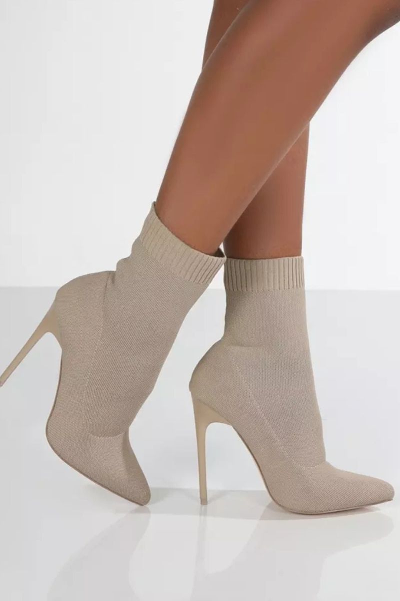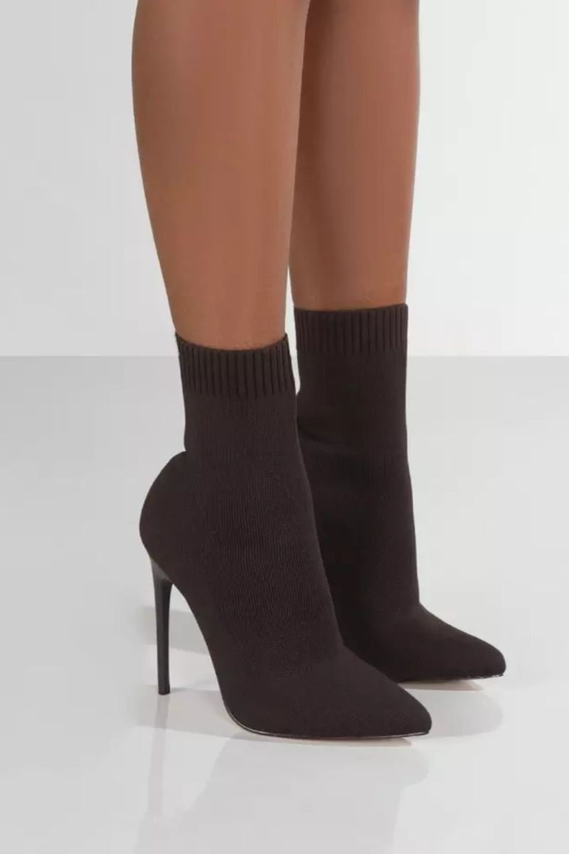 Expertly crafted with knit material, Allie Sock Ankle Boots feature a pointed toe and stiletto heel for a sleek and sophisticated look. The stretchy fabric ensures comfort and a snug fit, making them perfect for any occasion. Elevate your style with these must-have ankle boots.