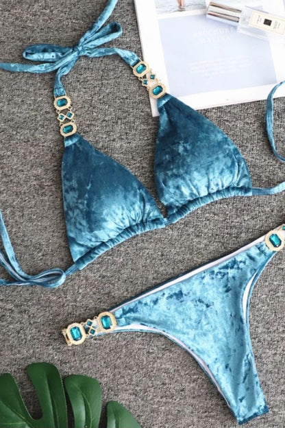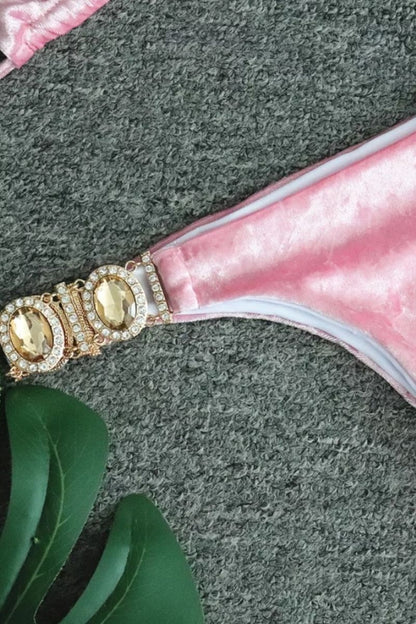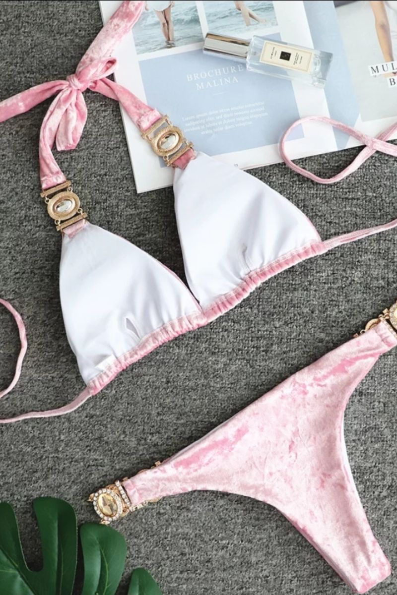 This Ariel Bikini Set combines sophistication and allure with its exclusive hardware on top and bottom. The high rise fit provides a flattering silhouette, while the removable padding allows for customizable comfort. Look boujee and glamorous at the beach or pool in this sexy set.