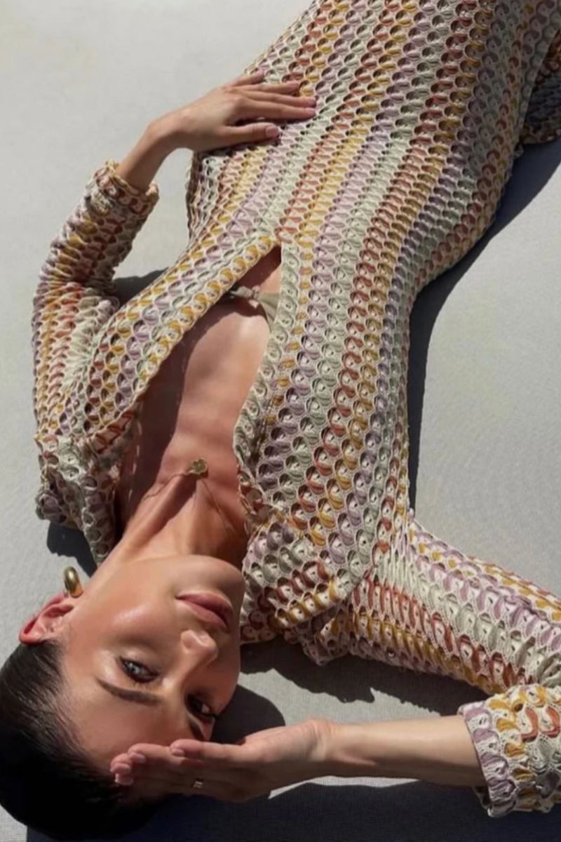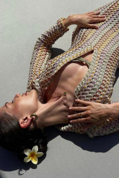 Enjoy the perfect balance of comfort and style with our Delphine Crochet Coverup Midi Dress. The v neckline adds a touch of elegance while providing a flattering fit for any body type. Made with high-quality crochet material, this dress is perfect for any occasion.