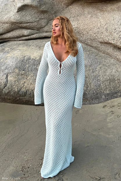 This is a crochet maxi dress with flared sleeves, a deep V-neckline, and a deep, rounded V-neckline at the back. There are two keyhole cut-outs in the front centre fastened with two MESHKI gold bar hardwares for a little extra bling. The long, flared sleeves and raw, floor-sweeping hem add full-coverage drama without looking overdone. The see-through, mesh-like fabrication is spun from an acrylic-and-cotton fabric blend for optimal comfort.
