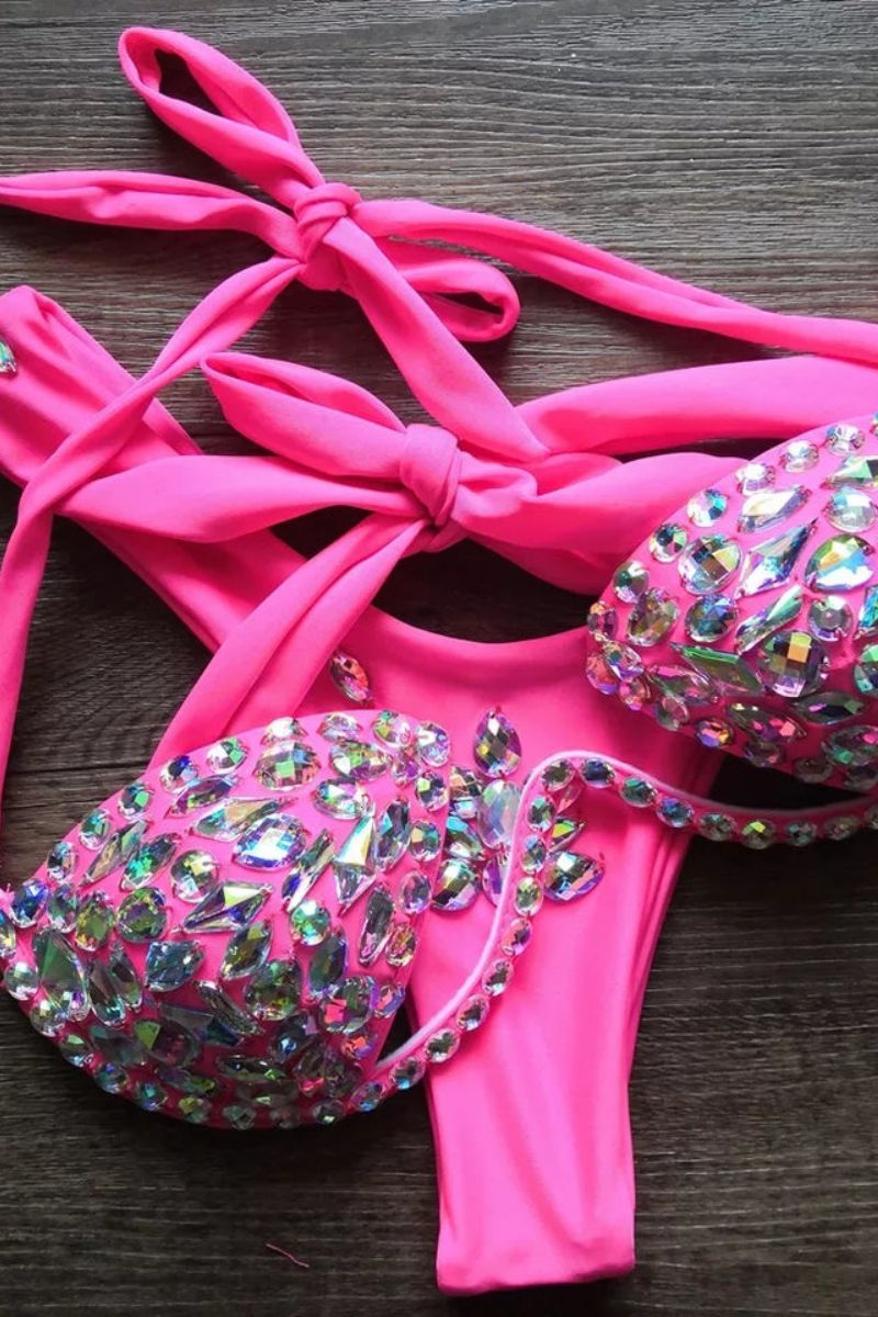 Our handmade Naya Bikini Set features a seductive cut and intricate rhinestone detailing. Perfect for making a statement at the beach or pool, this set combines quality craftsmanship with eye-catching design. Stand out from the crowd and exude confidence in this stylish and unique bikini set.