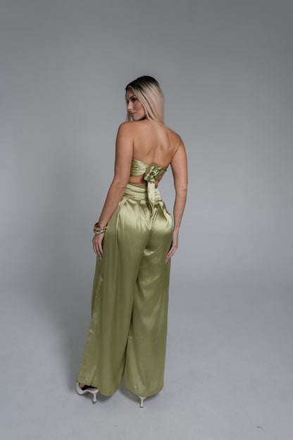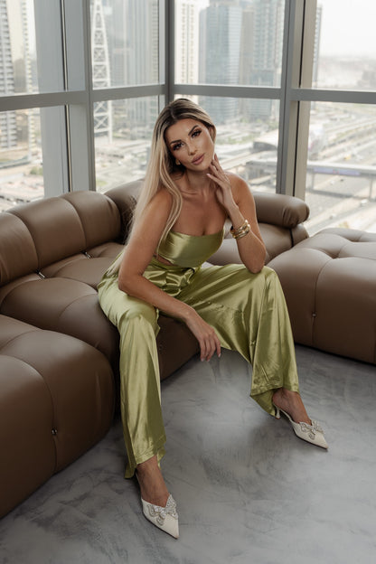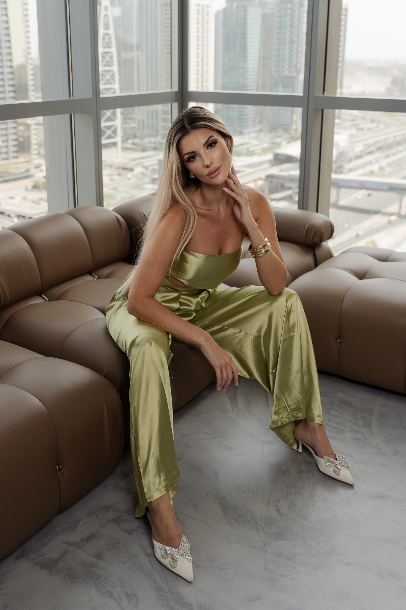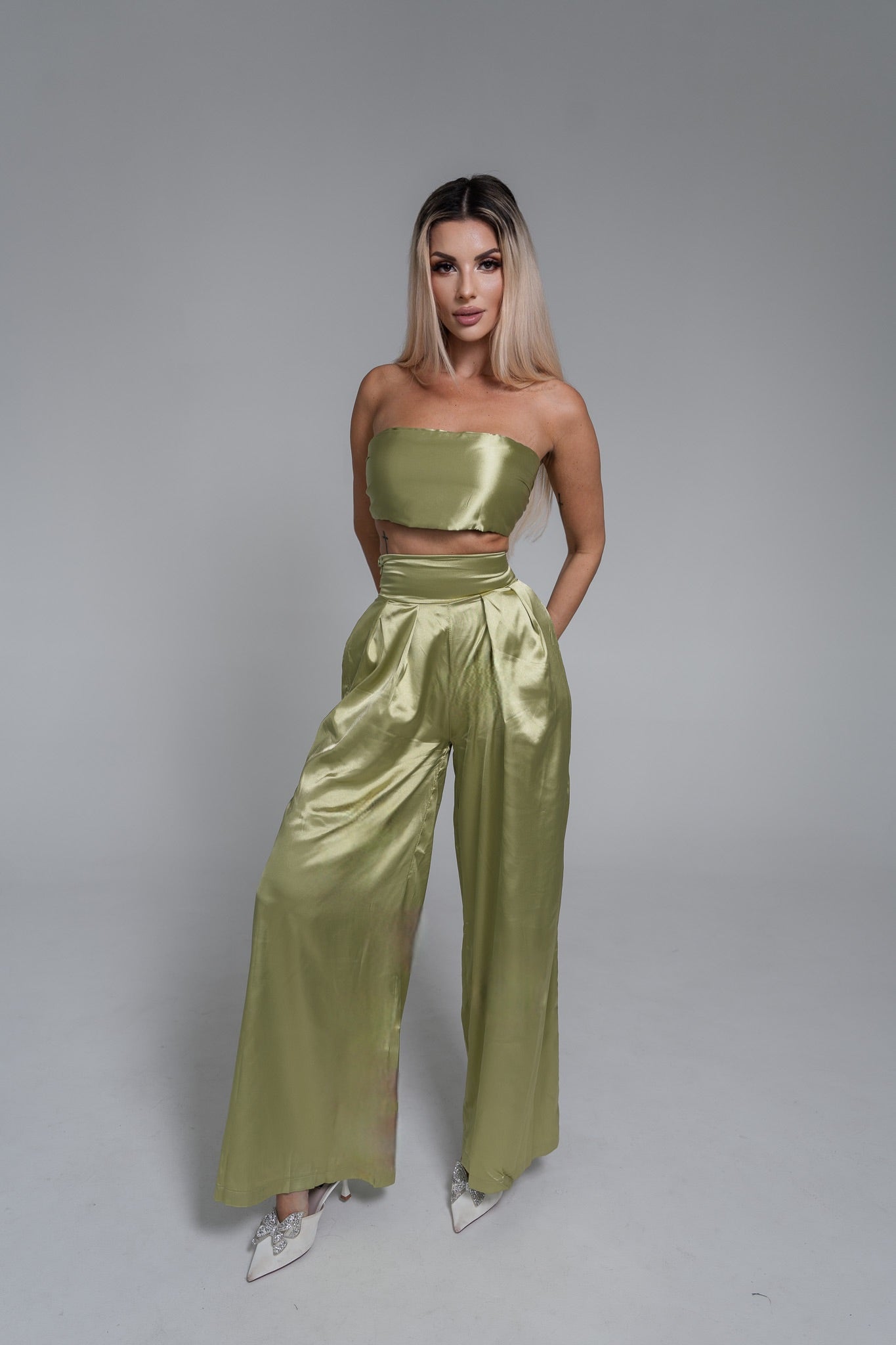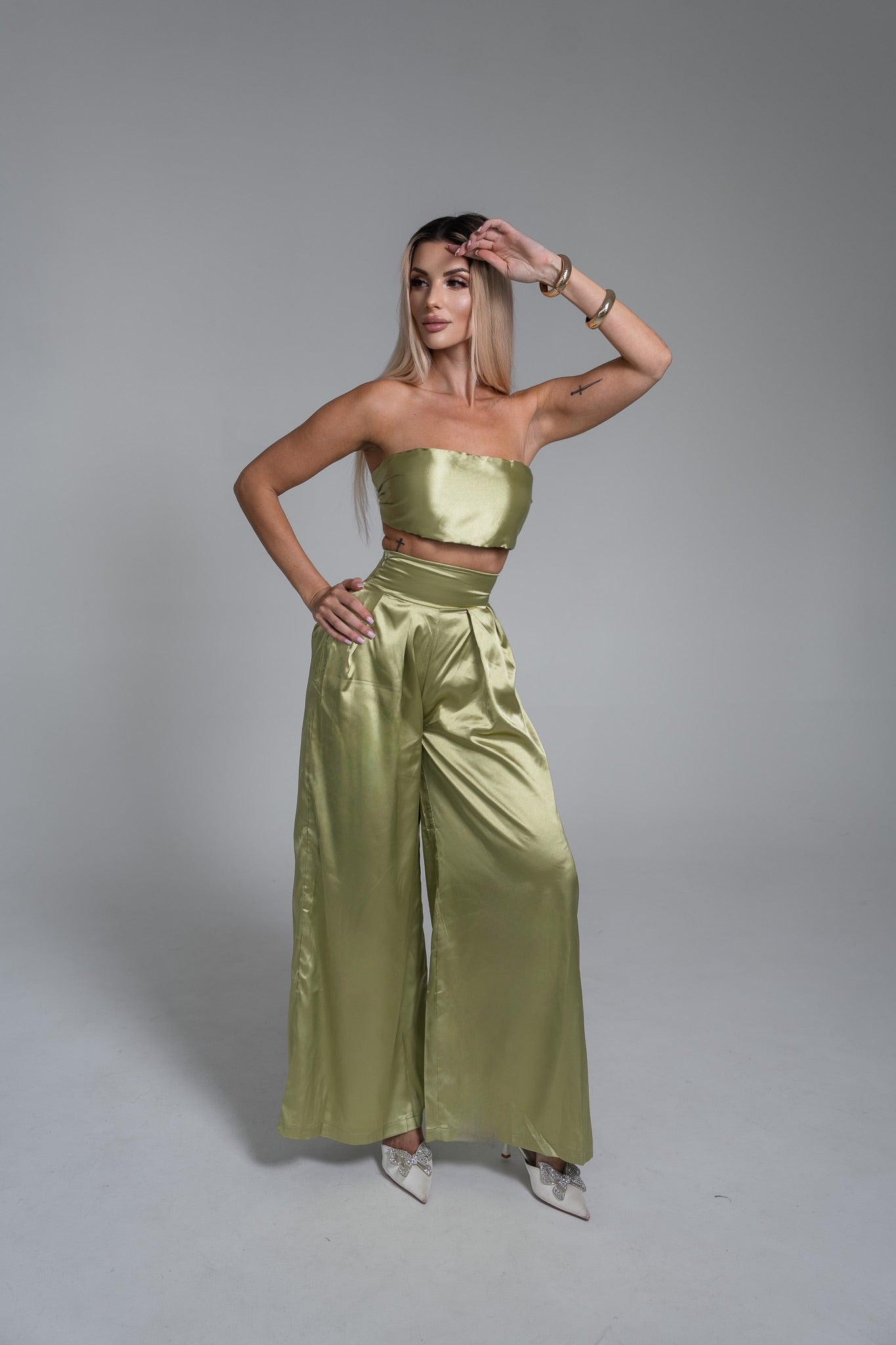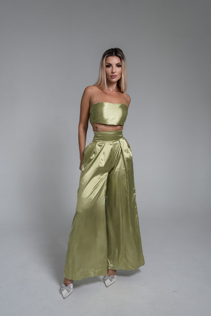 This two piece satin set, Ria, features a luxurious satin fabric that provides a comfortable and elegant feel. Perfect for any occasion, the set exudes sophistication and style. Elevate your wardrobe with this versatile and chic ensemble.Teamed with a pair of super flattering full length, wide leg palazzo pants that nip you in at the smallest part of the waist